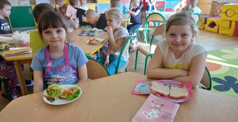 W tym tygodniu nasze przedszkolaki z oddziału 0a bardzo intensywnie wykorzystywały swoje zmysły podczas zajęć. Samodzielnie przyrządziły dla siebie pyszne kanapki, które z wielką ochotą zjadły na drugie śniadanie. Były bardzo dumne ze swojej pracy i teraz już śmiało mogą codziennie pomagać rodzicom w przygotowywaniu posiłków!
