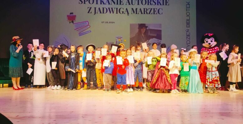Siódmego maja klasy drugie i trzecie wyruszyły do GOK-u, aby poznać sądecką pisarkę panią Jadwigę Marzec – autorkę wierszy, fraszek, bajek i opowiadań dla dzieci. Podczas spotkania dowiedzieliśmy się, że pisze także dla dorosłych. Pani Jadwiga opowiadała, jak pracowała pisząc biograficzną powieść o sądeckiej malarce Grażynie Kulig. Dowiedzieliśmy się również, że pisanie powieści to długi i trudny proces. Twórcza praca pisarki została uwieńczona sukcesem i powieść „Marzenia nie liczą lat” została wydana i od razu trafiła do czytelników. Pani Jadwiga Marzec to ceniona poetka, która z zamiłowania i wykształcenia jest także pedagogiem. Odnajduje się również jako malarka i amatorsko fotografuje. Jej debiut pisarski to książka dla dzieci ,,Niezwykły tydzień Frani”, która miała swoją kontynuację w postaci „Nowych przygód Frani”. Bohaterką tych powieści jest dziesięcioletnia Frania, która mieszka niedaleko Krakowa i często odwiedza swoich dziadków na Sądecczyźnie. Twórczość autorki związana jest z promowaniem naszego regionu. Podczas naszej wizyty Pani Jadwiga czytała fragmenty bajki „Poszukiwacze przygód – Traper i Lukier odkrywają Sądeckie” oraz ,,Myszka Matylda w Nowym Sączu”. W czasie słuchania poznawaliśmy ciekawe miejsca, postaci, wydarzenia związane z Nowym Sączem i jego okolicami. Razem z Matyldą,Traperem i Lukrem odkrywaliśmy piękną i bliską nam Ziemię Sądecką. Druga część wydarzenia to udział uczniów w korowodzie postaci bajkowych. Przyszła do nas Myszka Minnie i scena pełna była księżniczek, Czerwonych Kapturków, Pippi Pończoszanek, Harry Potterów itp. Bohaterowie bajek przedstawiali się i pięknie prezentowali na scenie. Pisarka zaprosiła również klasę 6B do udziału w WARSZTATACH LITERACKICH pt. ,,Obudzić wyobraźnię”. Uczniowie próbowali swoich sił jako twórcy literatury. Wiemy, że każdy artysta musi mieć wyobraźnię, teraz tylko ją obudzić i stworzyć dzieło literackie. Słowo to trudne tworzywo. Podczas zajęć chodziło o to „aby język giętki powiedział wszystko, co pomyśli głowa”. A każda głowa, czyli każdy z uczniów, budziła swoją wyobraźnię i tworzyła fabułę (czasem coś zasugerowała specjalistka, zawodowa pisarka). Następnie za pomocą odpowiednio dobranych słów każdy jak najlepiej chciał przekazać wymyślone przez siebie treści. Uczestnicy spotkania bawili się słowami. Może ktoś odkrył swój talent literacki? R. A. Salvatore powiedział: „Jeśli potrafisz porzucić pisanie, porzuć je. Jeśli nie potrafisz, jesteś pisarzem.” A życie pisarza wcale nie jest proste „składa się albo z pisania, albo myślenia o pisaniu.” Dziękujemy za zaproszenie!