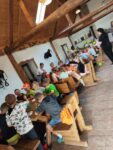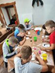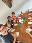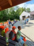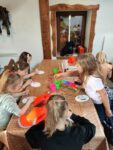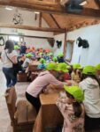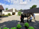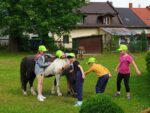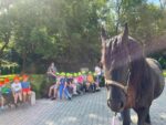 W miniony poniedziałek nasi pierwszoklasiści spędzili aktywny dzień w nawojowskiej stadninie koni. Pierwszym zadaniem, zaproponowanym przez organizatorów, było własnoręczne malowanie odlewów gipsowych przedstawiających wizerunek pięknego konia. Gdy dzieci skończyły swoje dzieła, pani Melanie zaprowadziła ich do stajni, w której mieszkają podopieczni stadniny. Przewodniczka opowiedziała co nieco o tych dostojnych zwierzętach, po czym zaprezentowała jak wygląda pielęgnacja i siodłanie konia. Kolejnymi atrakcjami były: przejażdżka na pięknej, czarnogrzywej klaczy i przejazd ciagnikiem. Choć grafik tego dnia był bardzo napięty, to znalazł się również czas na pieczenie kiełbasek, lody i szaleństwa na placu zabaw. Dzieciom uśmiech nie schodził z twarzy, co sprawiało radość również ich opiekunom!