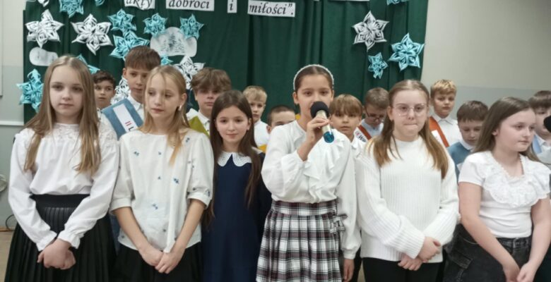 Uroczystość uświetnił program artystyczny, który zaprezentowali uczniowie klas IV a, IV b i V b. Podczas przedstawienia poznaliśmy dwanaście miesięcy, cztery pory roku i ich niezwykłe dary, które ofiaruje nam kolejny 2025 rok. Na zakończenie występu uczniowie przekazali zgromadzonym noworoczne życzenia.