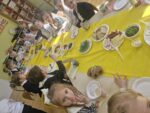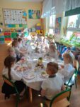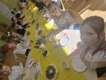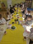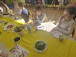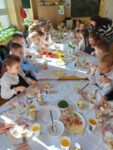 Po zakończeniu śniadania dzieci z oddziału 0b udały się na spacer, podczas którego z radością odkrywały czekoladowe jajeczka pozostawione przez wielkanocnego zajączka. Natomiast dzieci z oddziału 0a odwiedziły dyrekcję i pracowników szkoły, przekazując im serdeczne życzenia wielkanocne i wnosząc do szkoły atmosferę świątecznej radości!