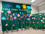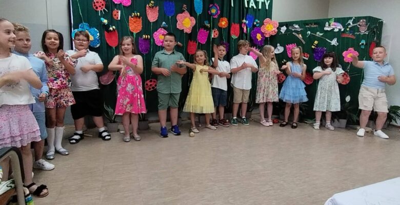 Uczniowie klasy I b zaprosili swoich rodziców na cudowną łąkę ukwieconą barwnymi kwiatami, przyozdobioną latającymi pszczołami i biedronkami oraz kolorowymi ptakami, które usiadły na gałęziach by zaśpiewać każdej mamusi i każdemu tatusiowi z okazji ich święta. Dzieci przygotowywały się do tego dnia przez kilka tygodni podczas „Kreatywnych warsztatów artystycznych” i robiły to z wielką radością i entuzjazmem. Najpierw własnoręcznie wykonały zaproszenia tematycznie związane z hasłem tego dnia wykorzystując bibułkarstwo, później uczyły się wierszy i piosenek by zaprezentować je podczas akademii a następnie przygotowały upominki: namalowały farbami maki dla mam a motyle dla tatusiów. Były z siebie bardzo dumne, że same przygotowały tak wiele pięknych rzeczy.  W łąkowej sali na sztalugach stały portrety rodziców i prawie każdy z nich stwierdził, że bardzo jest podobny do siebie. Dzieci włożyły w to święto całe swoje serce, swój wielki talent artystyczny i aktorski oraz mnóstwo dziecięcej radości, która rozlewała się po całej sali. Najmłodsze rodzeństwo też przyłączyło się do wspólnego świętowania. W miłej rodzinnej atmosferze spędziliśmy niezapomniane chwile.