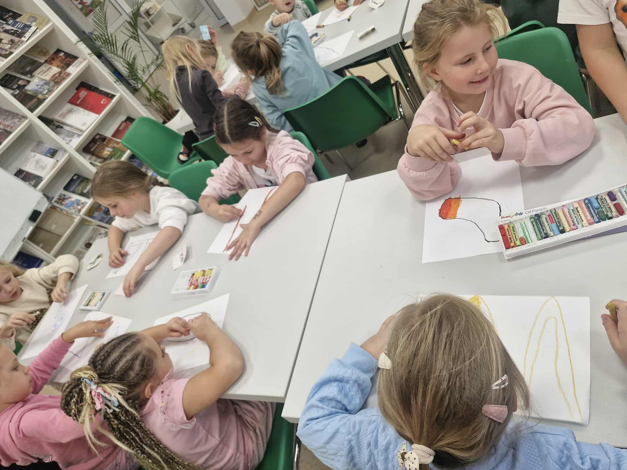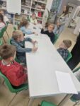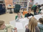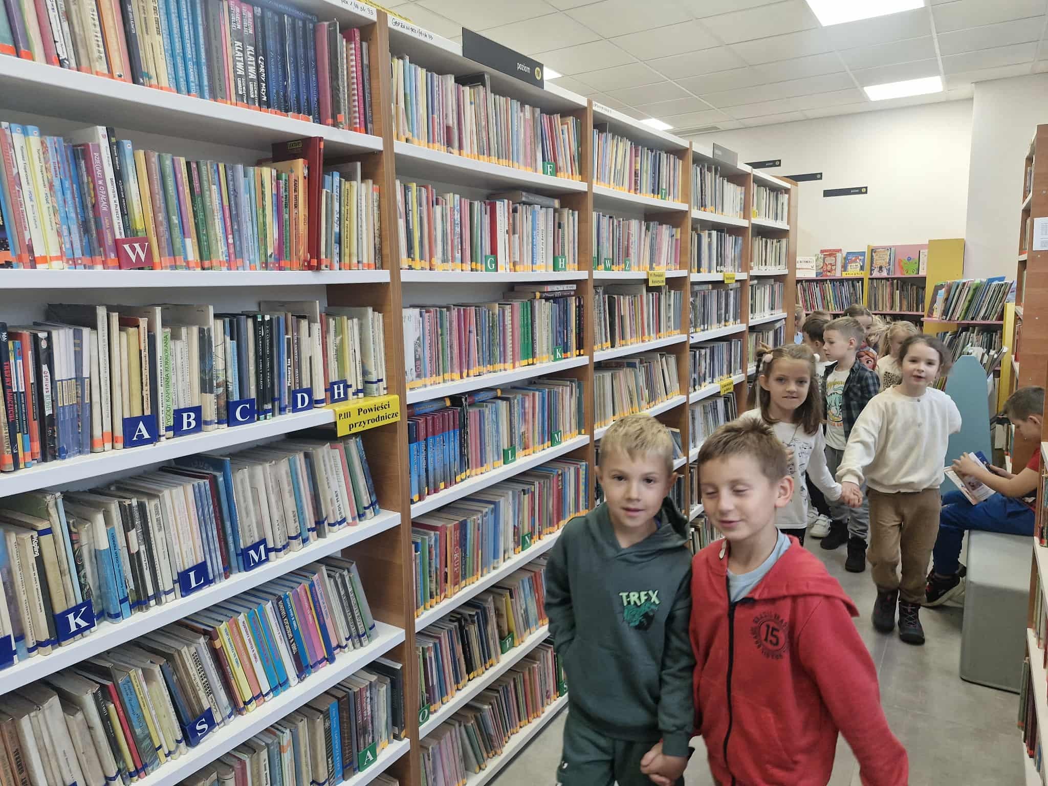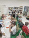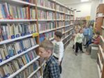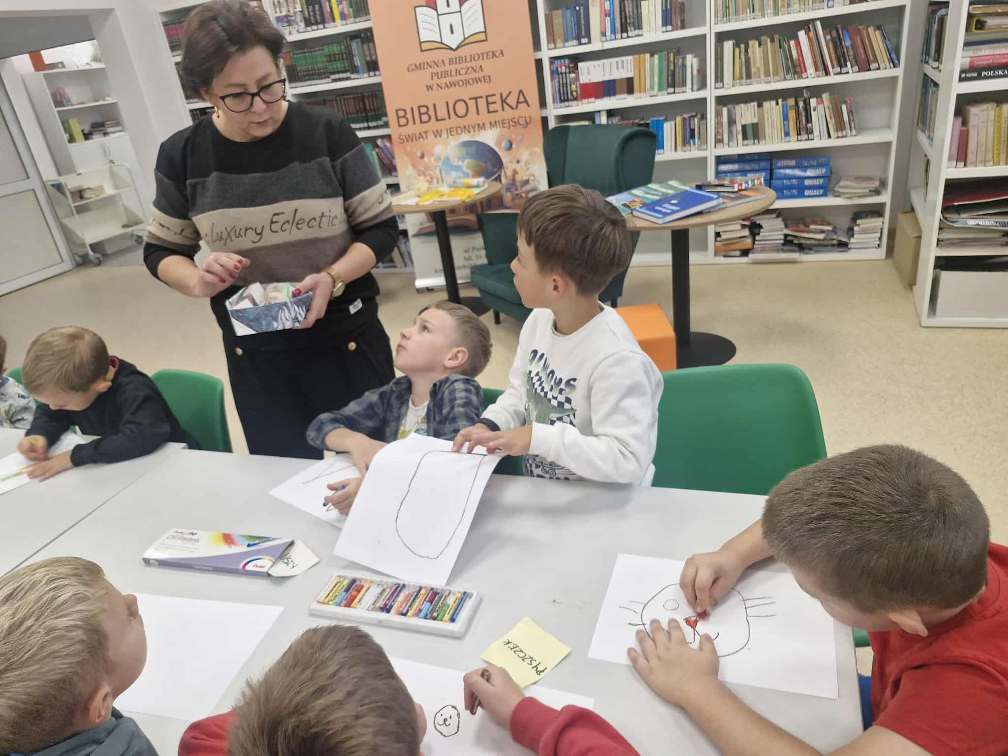 Dzisiaj dzieci z oddziału 0b odwiedziły nawojowską bibliotekę. Miały okazję ją zwiedzić oraz zapoznać się z księgozbiorem. Dowiedziały się, jak można wypożyczać książki, a także jak należy o nie dbać. Następnie wzięły udział w ciekawych zajęciach przygotowanych przez panią bibliotekarkę. Wysłuchały opowiadania pt. ,,Kotki Dorotki”, a później wspólnie stworzyły własne koty — nie były to jednak zwykłe prace plastyczne! Aby powstał jeden kot, musiało ze sobą współpracować kilkoro dzieci. Zadanie wymagało dobrej komunikacji, podziału ról i wzajemnej pomocy. To była doskonała okazja do rozwijania kreatywności, umiejętności współpracy oraz poznania fascynującego świata książek. Dzieci wróciły do szkoły zadowolone i pełne wrażeń.
