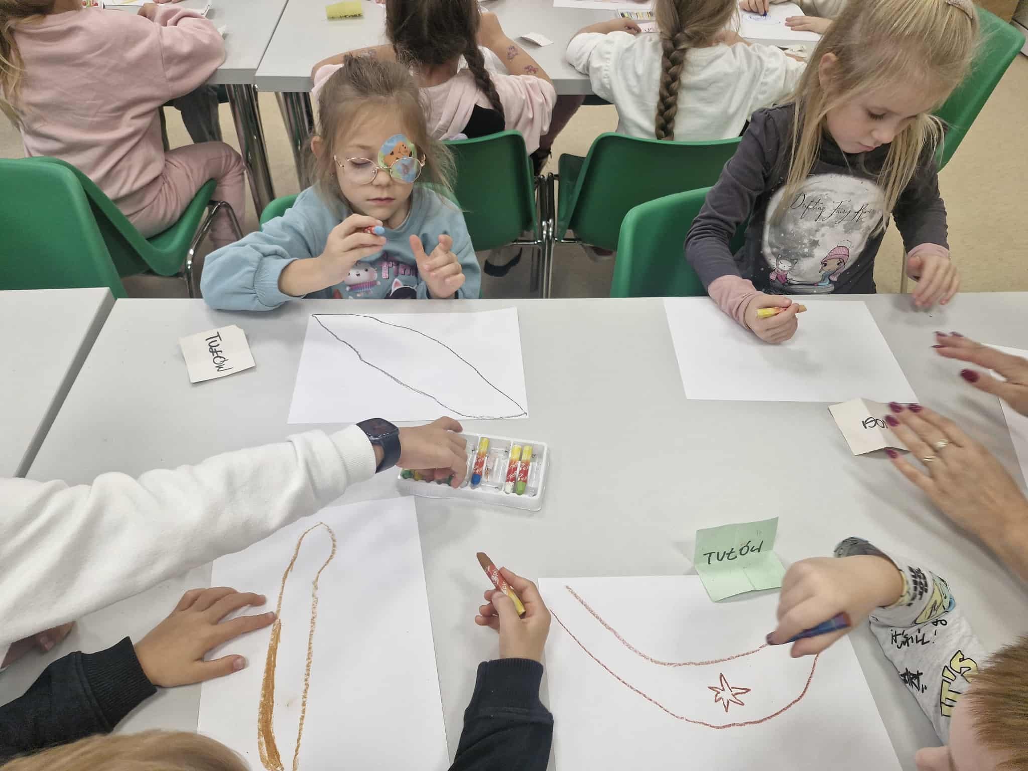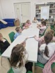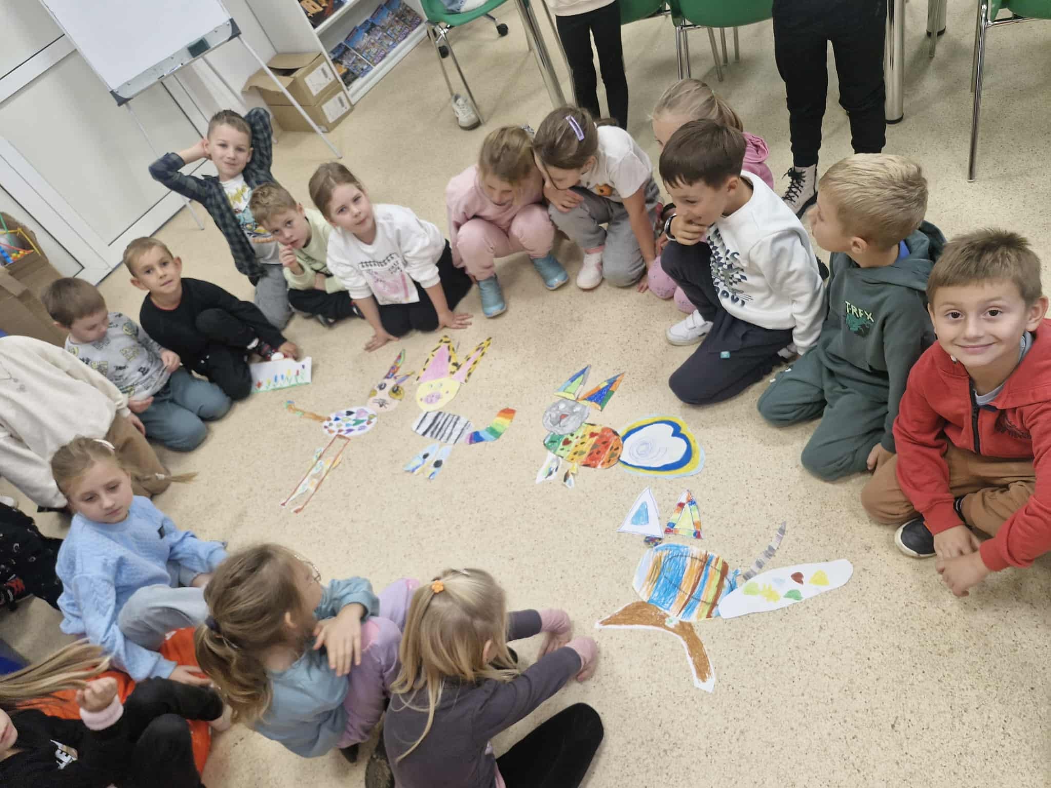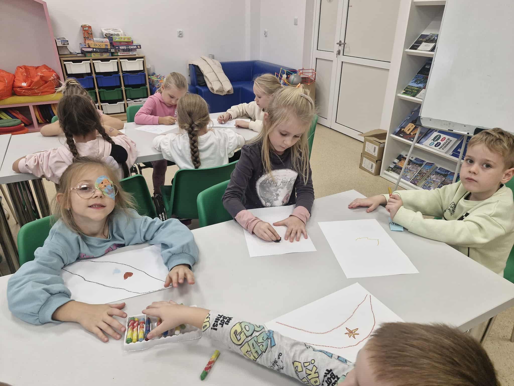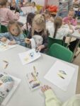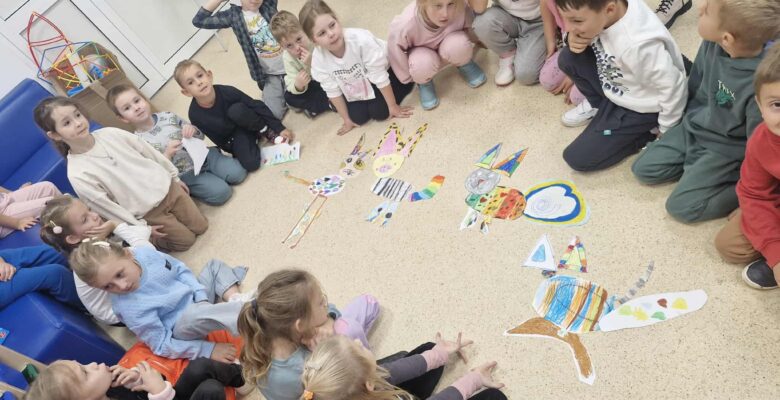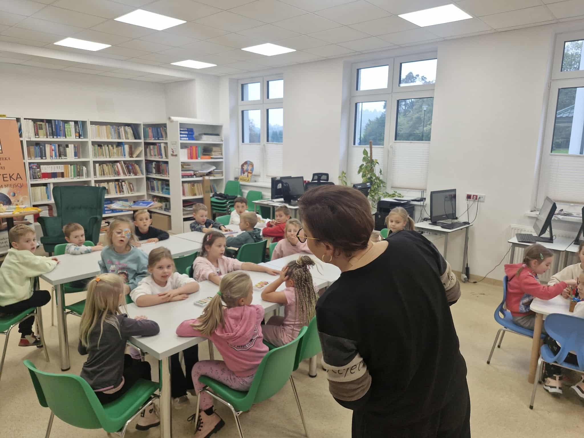 Dzisiaj dzieci z oddziału 0b odwiedziły nawojowską bibliotekę. Miały okazję ją zwiedzić oraz zapoznać się z księgozbiorem. Dowiedziały się, jak można wypożyczać książki, a także jak należy o nie dbać. Następnie wzięły udział w ciekawych zajęciach przygotowanych przez panią bibliotekarkę. Wysłuchały opowiadania pt. ,,Kotki Dorotki”, a później wspólnie stworzyły własne koty — nie były to jednak zwykłe prace plastyczne! Aby powstał jeden kot, musiało ze sobą współpracować kilkoro dzieci. Zadanie wymagało dobrej komunikacji, podziału ról i wzajemnej pomocy. To była doskonała okazja do rozwijania kreatywności, umiejętności współpracy oraz poznania fascynującego świata książek. Dzieci wróciły do szkoły zadowolone i pełne wrażeń.