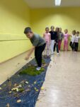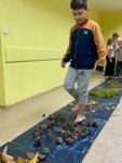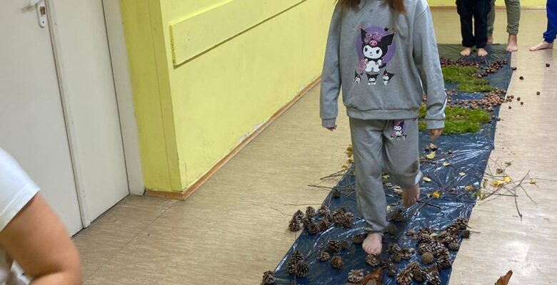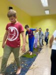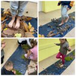 Dzieci spacerowały po różnych fakturach, porównywały wrażenia dotykowe, nazywały kolory i zapachy, a przy okazji uczyły się uważności i relaksu. To była wspaniała zabawa, która rozwijała ich zmysły, równowagę oraz integrowała grupę.