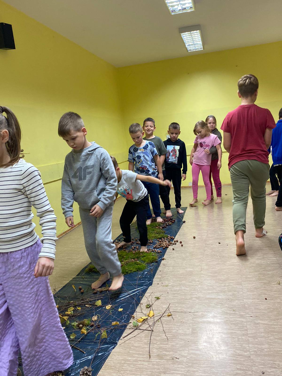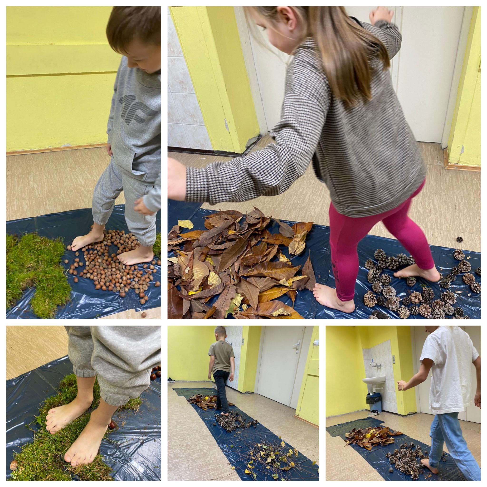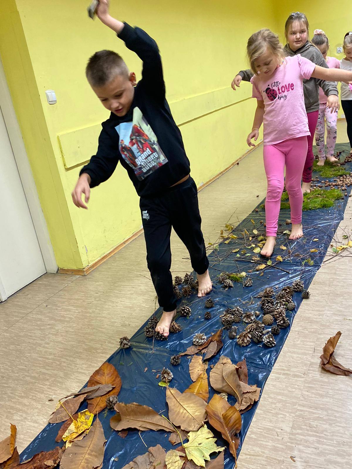 Dzieci spacerowały po różnych fakturach, porównywały wrażenia dotykowe, nazywały kolory i zapachy, a przy okazji uczyły się uważności i relaksu. To była wspaniała zabawa, która rozwijała ich zmysły, równowagę oraz integrowała grupę.
