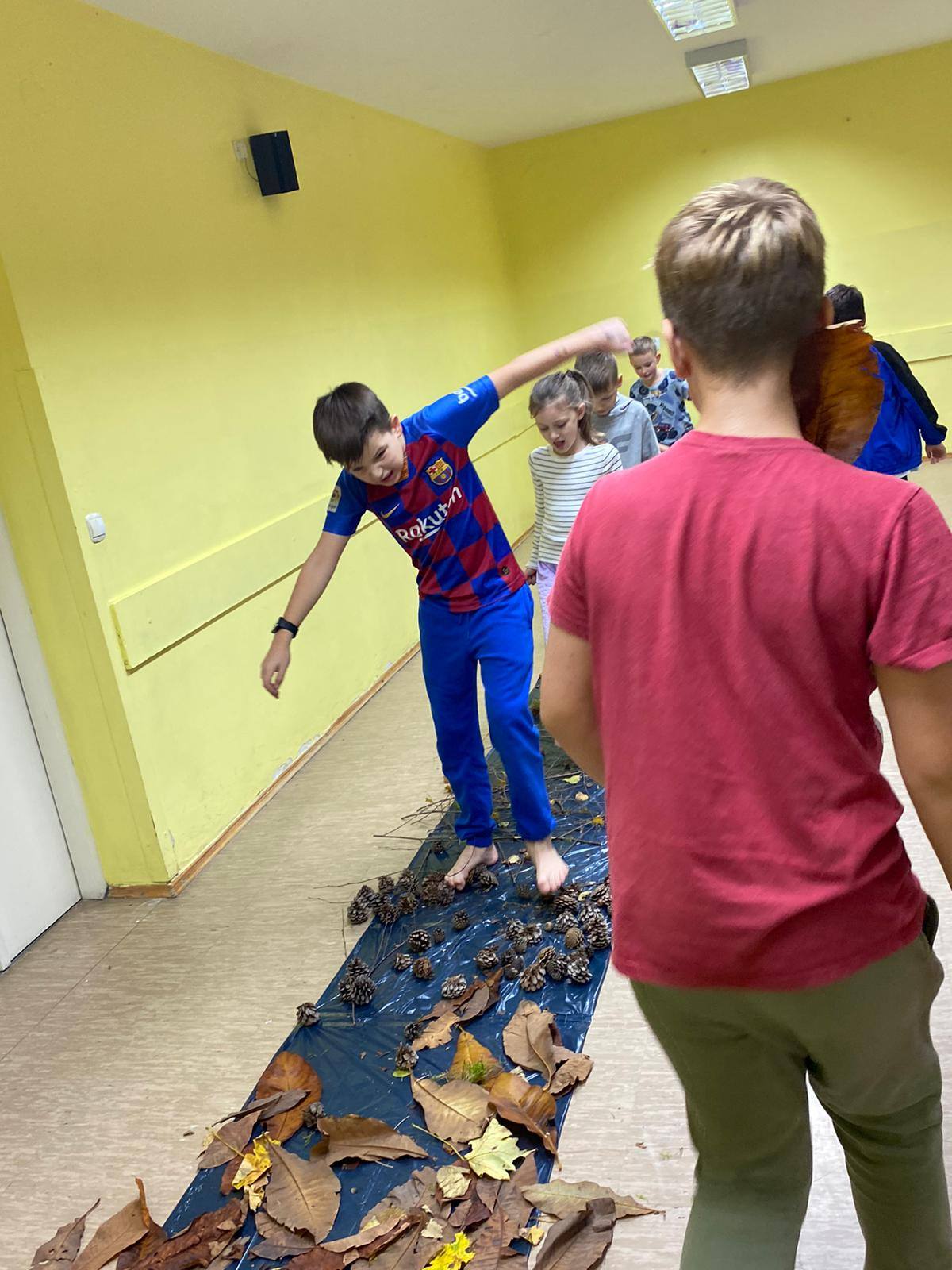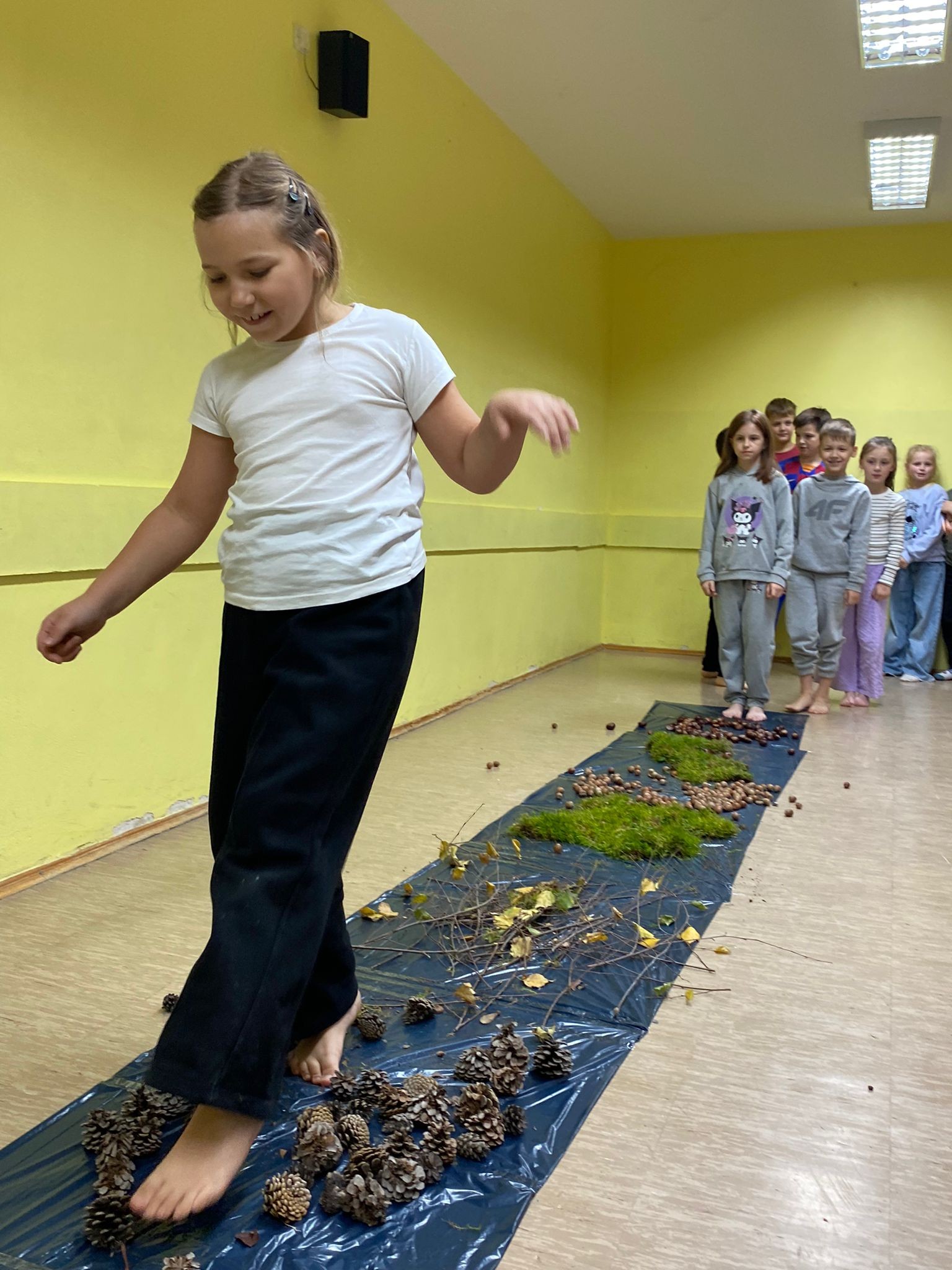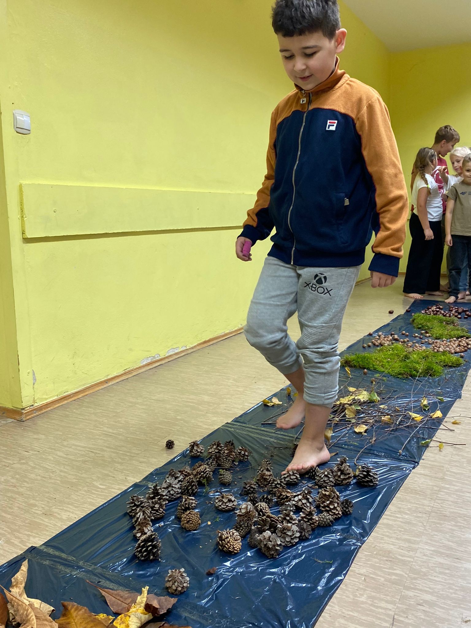 Dzieci spacerowały po różnych fakturach, porównywały wrażenia dotykowe, nazywały kolory i zapachy, a przy okazji uczyły się uważności i relaksu. To była wspaniała zabawa, która rozwijała ich zmysły, równowagę oraz integrowała grupę.