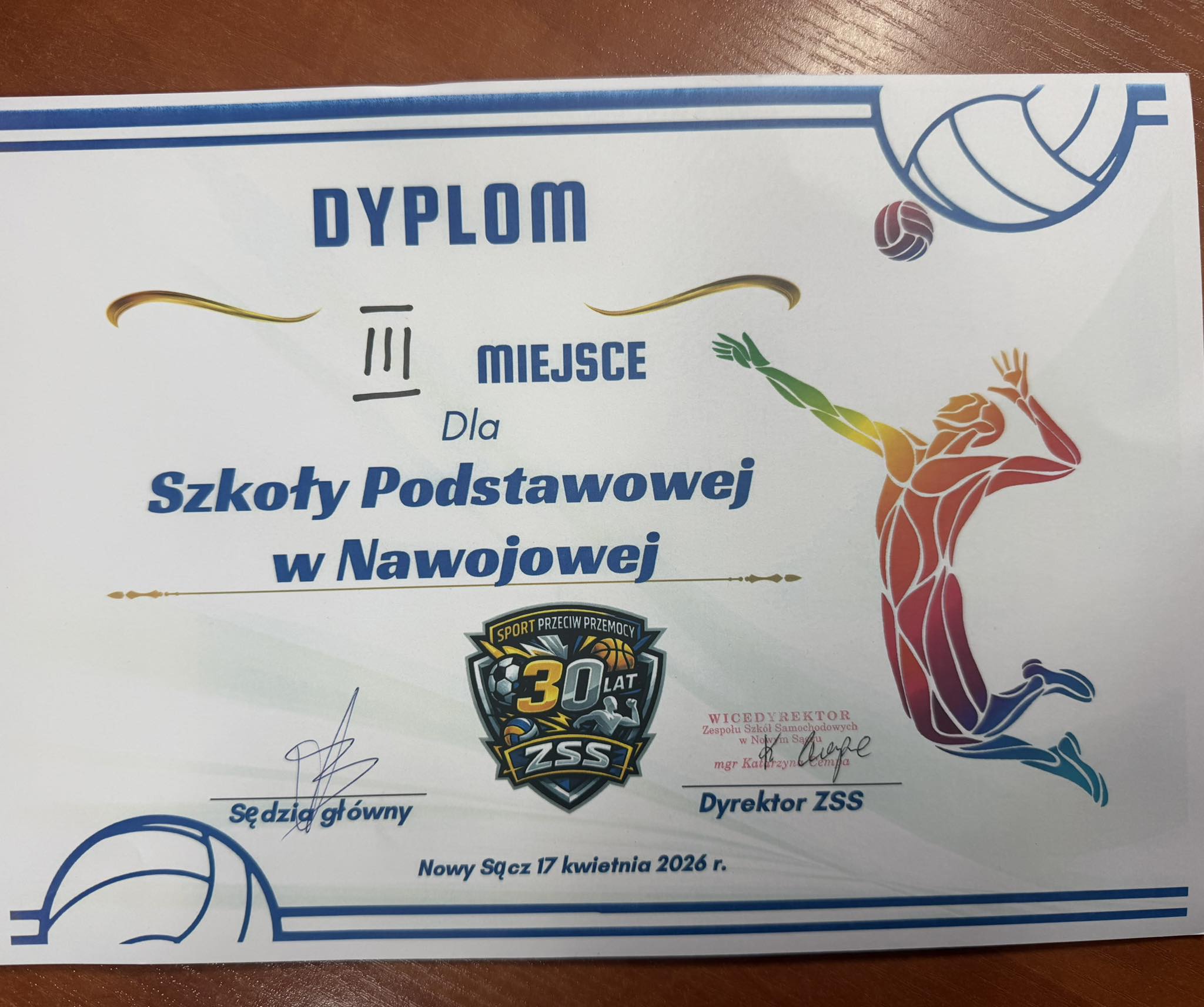 17 kwietnia 2026 r. w Zespole Szkół Samochodowych w Nowym Sączu odbył się turniej piłki siatkowej dla szkół podstawowych, zorganizowany z okazji 30-lecia akcji „Sport Przeciw Przemocy”. W sportowych zmaganiach wzięło udział aż 9 szkół oraz blisko 100 zawodników i zawodniczek. Nasi uczniowie zagrali znakomicie i jesteśmy z nich bardzo dumni. To dla nas ogromny sukces, który jest efektem zaangażowania i współpracy całej drużyny. Serdecznie gratulujemy: